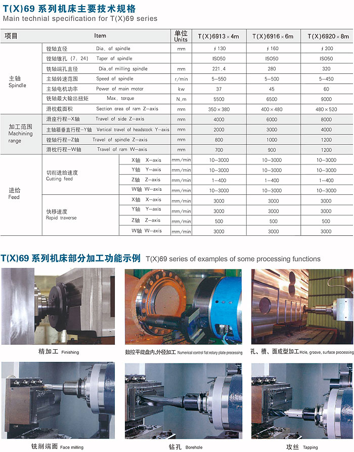 T (X) 69 series of ordinary, digital floor boring and milling machine ● The overall structure of the machine The series of machine tools using square ram type side hanging spindle box, single moving column, bed and platform split floor layout. The boring shaft is housed in the milling shaft and is supported in the square ram with the milling shaft. The column moves horizontally along the bed rail to form the x-axis feed movement. The spindle box moves vertically along the column guide to form the Y-axis feed movement, and the boring axis moves longitudinally along the milling axis to form the z-axis feed motion. The square ram is moved longitudinally along the main shaft of the closed box to form the w-axis feed movement. ● Basic parts of the process of protection The basic parts of the machine are composed of bed, slide, column, spindle box and so on. The machine tool is large. HT250 300 High quality alloy wear-resistant cast iron, which is subjected to vibration aging time. Furnace aging effect of a vibration aging finishing, eliminating the workpiece stress, to ensure long-term operation accuracy of the machine.